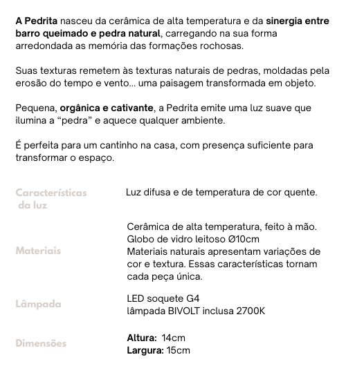 Peças fabricadas artesanalmente e sob demanda. Possuem o prazo de produção de até 35 dias úteis para expedição. Soma-se o prazo da transportadora.